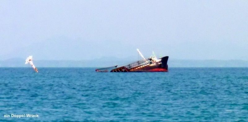Wieder ein schöner, sonniger, heisser Tag. Es kommen wieder Segler an. Inzwischen sind etwa 25 Schiffe da. Am Morgen machen Paul und ich einen Abstecher per Dinghy, zu dem in der Nähe gelegenen Wrack eines Frachters. Es heisst Tapan Jaya. Genau genommen sind es zwei Schiffe die hier übereinander liegen. Eines ist gesunken und das andere ist darauf gefahren und auch gesunken! Wir schnorcheln darum herum und sind ziemlich enttäuscht. Die Sicht ist sehr schlecht und Fische sind auch keine da!