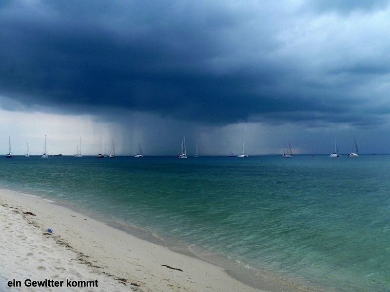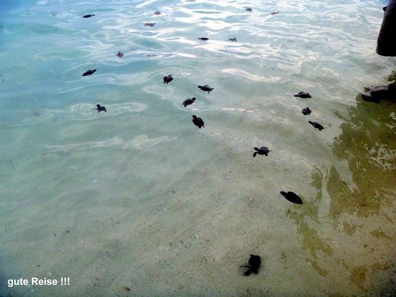 Nachmittags um 13h fährt ein Boot auf die Hauptinsel, zur Massenhochzeit. Um 15h werden die Schildkröten freigelassen. Wir müssen uns entscheiden was wir wollen, beides geht nicht. Paul und ich beschliessen, die Schildchrötli auf den Weg zu schicken. Weil der Regent, irgend so ein Stadtpräsident, von der Hauptinsel noch nicht da ist, werden wir mit schöner Musik und Gesang unterhalten. Ein mächtiges Gewitter braut sich zusammen. Paul und andere Segler eilen per Dinghy auf die Schiffe, um alle Luken und Fenster zu schliessen. Die Musikband schafft schleunigst ihre elektronischen Geräte in die „Dining Hall“ ans Trockene. Und schon geht der heftige Regen los. Nach 1½ Stunden hört er endlich wieder auf und der Regent erscheint. Jetzt dürfen die über 200 Stück, 3 Monate alten Schildkrötli ins Meer entlassen werden. Jöhhh, sind die herzig, die kleinen Krabbler!!!