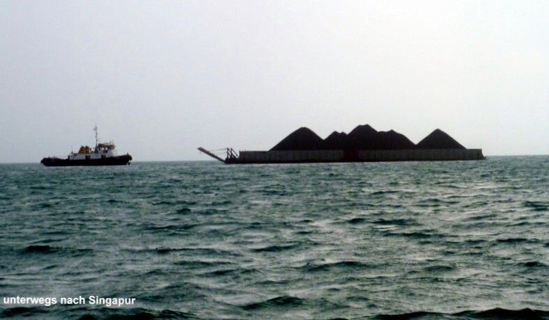 Am Nachmittag braut sich an der Nordküste der Insel Belitung ein Riesengewitter zusammen. Man sieht nur eine schwarze Wand. Wir haben Glück und es erwischt uns nicht. In der Nacht steht ein halber Mond am Himmel und leuchtet uns. Es gibt keine Probleme und wir haben eine sehr ruhige Fahrt.