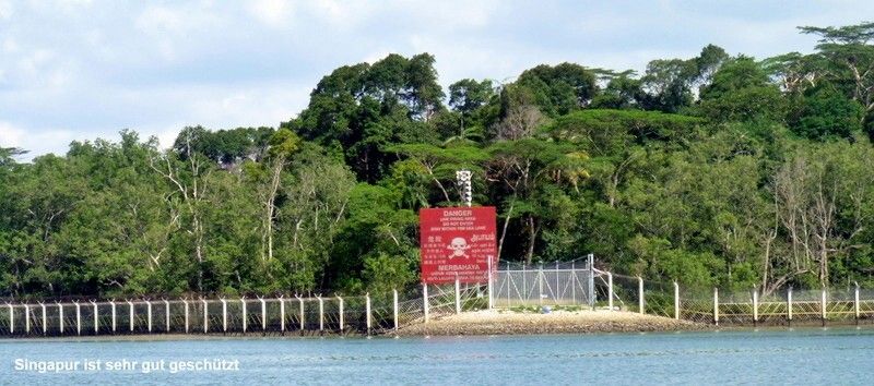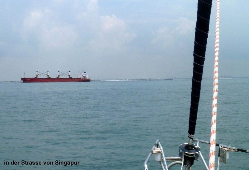 Die Nacht war zeitweise hell und zeitweise sehr bewölkt. Plötzlich sind sehr viele Fischfallen, Fischerboote und grosse Schiffe da. Jetzt heisst es aber aufpassen und Augen offenhalten! Die „Island Prism“ ist immer in unserer Sichtweite, vor, links, rechts oder hinter uns. Eigentlich wollten wir bei der letzten indonesischen Insel ankern und die Nacht verbringen. Aber es regnet saumässig und Andrea und Jim teilen uns an der Funke mit, dass sie direkt weiter nach Singapur fahren. Und weil es regnet machen wir das auch. Um die Mittagszeit queren wir die Strasse von Singapur, eines der meistbefahrenen Schifffahrtsnadelöhre der Welt. Puhhh, hat das hier viele grosse Pötte! Aber trotzdem ist es nicht so schlimm, wie ich erwartet hatte, und der Skipper ist ganz ruhig (äusserlich!) , keine Alarmstufe rot!!! Alles ganz easy! Als wir durch sind, scheint die Sonne wieder. Wir biegen westlich der Stadt Singapur in den Fluss ein. Die „Island Prism“ wollen in die Raffles Marina in Singapur.