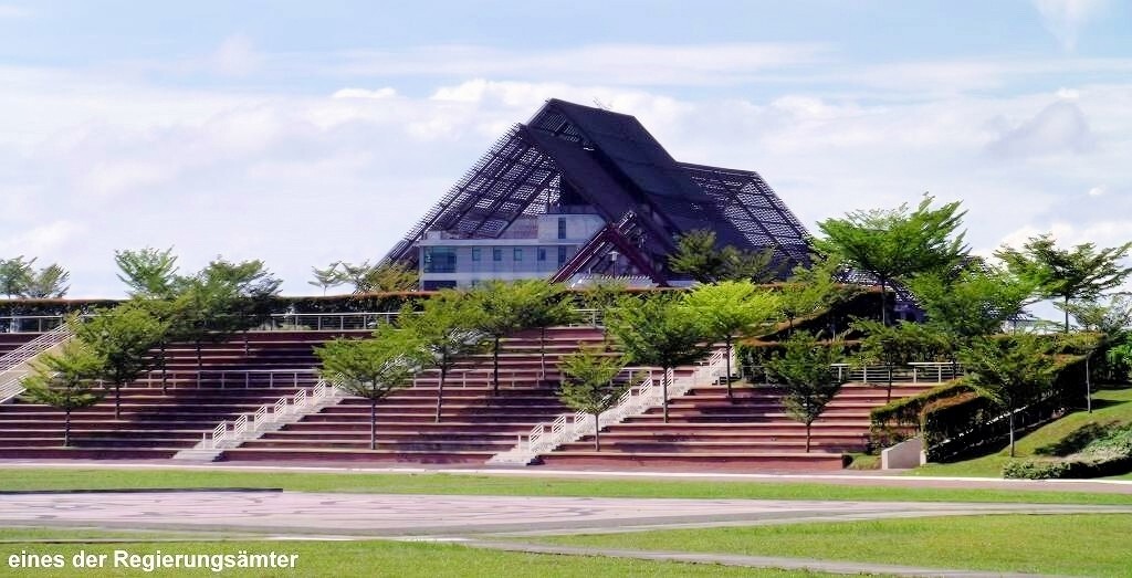 Aber wir sind rechtzeitig im Bus, der dann doch erst um 7h30 losfährt. Es sind drei Busse im Einsatz. Das Wetter ist schön. Zuerst fahren wir zur Puteri Marina, wo ein paar Segelschiffe der „sailmalaysia“ stationiert sind, und wir holen die Leute dort ab. Rund um die Marina wird unheimlich gerodet und gebaut. Überhaupt herrscht hier eine wahnsinns Bauwut. Überall schiessen Hochhäuser und riesige Einfamilienhaussiedlungen mit etwa 500 fast identischen Einfamilienhäuschen aus dem Boden. Von den Shopping Malls ganz zu schweigen. Es gibt sogar ein „LEGOLAND“. Die Strassen führen unter-und übereinander hindurch und wir sind froh, nicht selber fahren zu müssen. Jetzt geht es auf superschönen Schnellstrassen Richtung „Kota Iskandar“, das ist das ganz neu erbaute Regierungsviertel des Sultanats Johor Bahru, im Grünen.