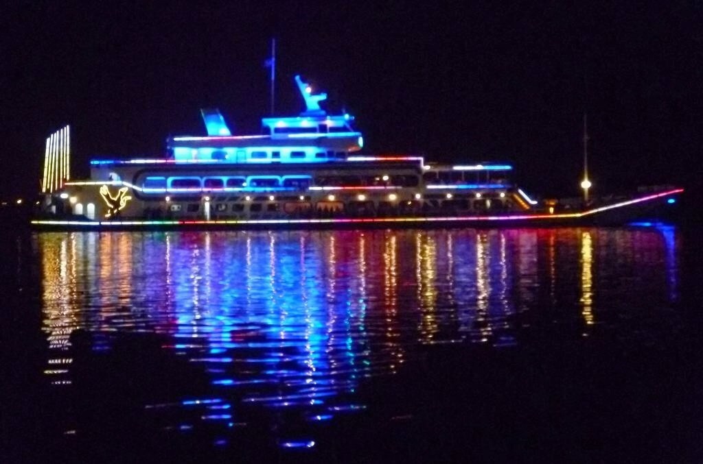 Eine Musikband spielt, eine Tanzgruppe tanzt und drei Sänger lösen sich mit Singen ab. Das Essen wird genau nach Menükarte gebracht und einzeln gegessen. Es ist alles super gut und der Service tadellos. Das einzige Haar in der Suppe: wir erfrieren fast in dem tiefgekühlten Raum. Paul eilt schnell auf's Schiff und holt sich einen warmen Pullover. Ich habe zum Glück mit einem Schal vorgesorgt. Um 22h ist Feierabend. Danach sitzen wir mit Kathrin und Swen draussen bei einem Bier und wärmen uns wieder auf.