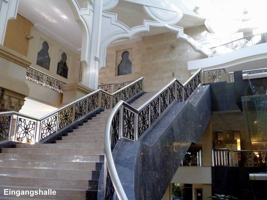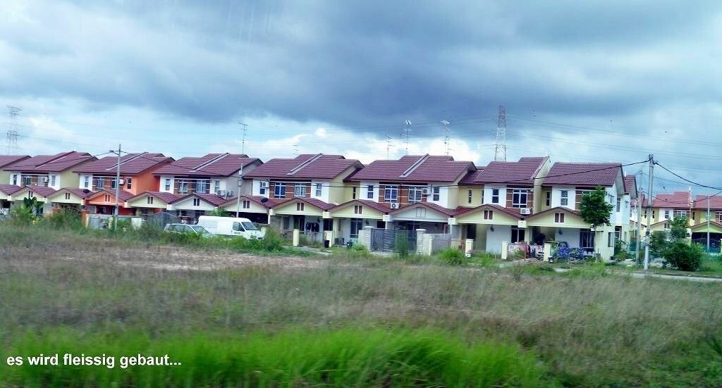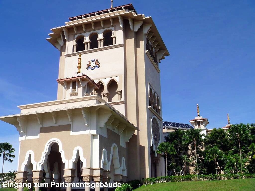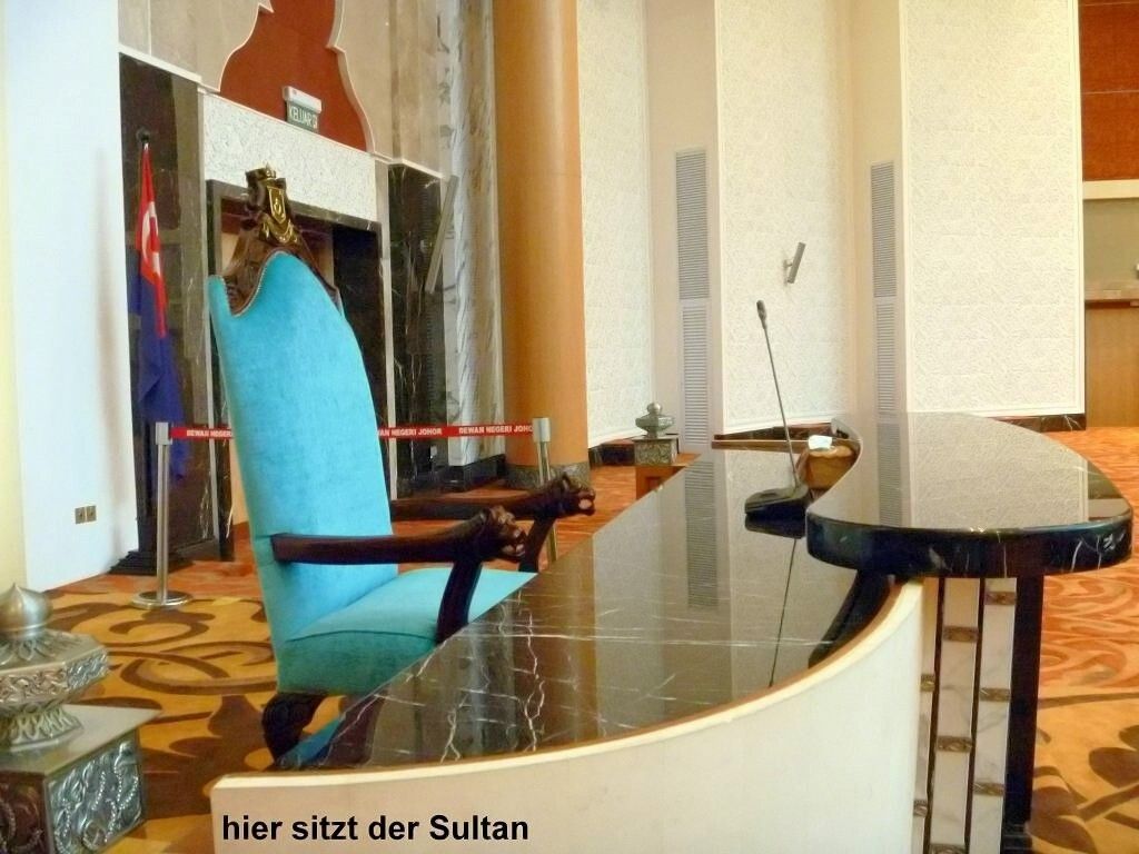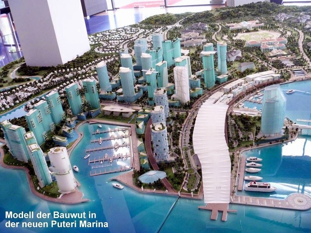 Aber wir sind rechtzeitig im Bus, der dann doch erst um 7h30 losfährt. Es sind drei Busse im Einsatz. Das Wetter ist schön. Zuerst fahren wir zur Puteri Marina, wo ein paar Segelschiffe der „sailmalaysia“ stationiert sind, und wir holen die Leute dort ab. Rund um die Marina wird unheimlich gerodet und gebaut. Überhaupt herrscht hier eine wahnsinns Bauwut. Überall schiessen Hochhäuser und riesige Einfamilienhaussiedlungen mit etwa 500 fast identischen Einfamilienhäuschen aus dem Boden. Von den Shopping Malls ganz zu schweigen. Es gibt sogar ein „LEGOLAND“. Die Strassen führen unter-und übereinander hindurch und wir sind froh, nicht selber fahren zu müssen. Jetzt geht es auf superschönen Schnellstrassen Richtung „Kota Iskandar“, das ist das ganz neu erbaute Regierungsviertel des Sultanats Johor Bahru, im Grünen.