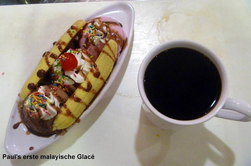 Nach einem nicht so besonderen indischen Mittagessen bekommt Paul seine erste malayische Glacé, einen Bananasplit und ich ein Käffchen. Später finden wir einen indischen, sehr schönen Tabakladen, wo Paul sich wieder einmal ein paar „Villiger Stumpen“ leistet. Wir spazieren ein wenig in der Stadt herum, bis es unheimlich anfängt zu regnen und wir irgendwo unterstehen müssen. Mit dem Bus geht es zurück zur Marina.