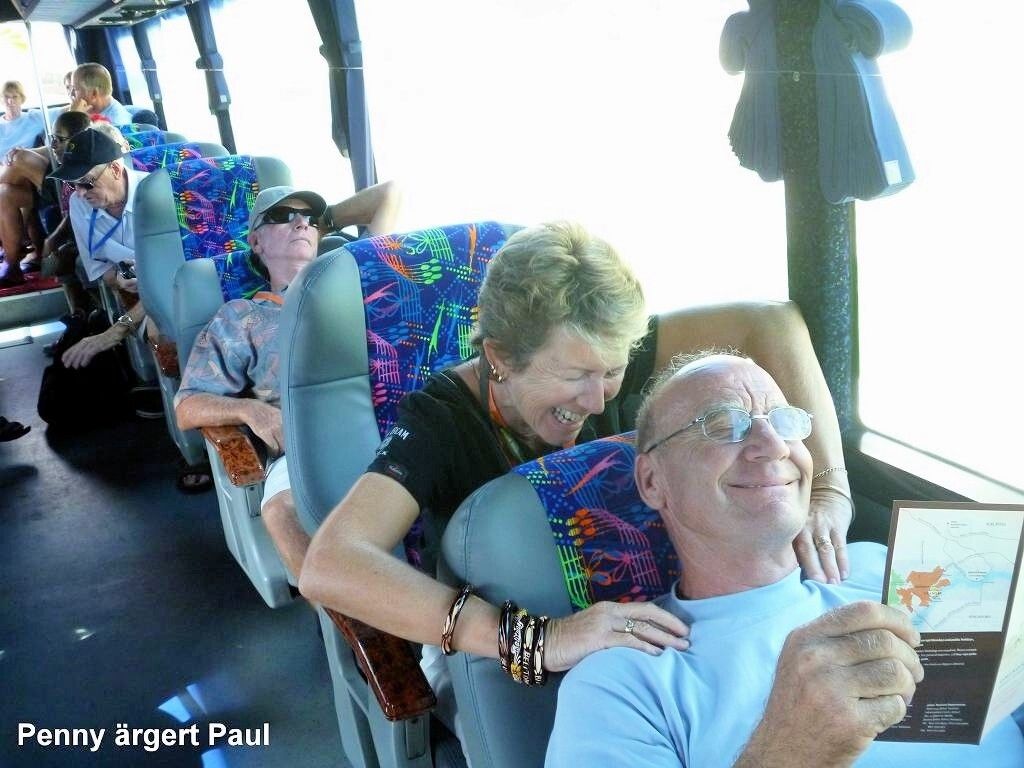 Um 6h50 schrecke ich aus dem Schlaf auf. Wir haben verschlafen und ich wecke Paul. Aber er meint ganz cool: “Ich bin schon lange wach!“ Toll, mein Wecker! Um 7h00 sollen wir beim Bus für den Tagesausflug sein!!! Zum Frühstück gibt es einen Becher kalte Milch (für den unzuverlässigen Wecker mit Kakaopulver) und einen Waffelriegel dazu.