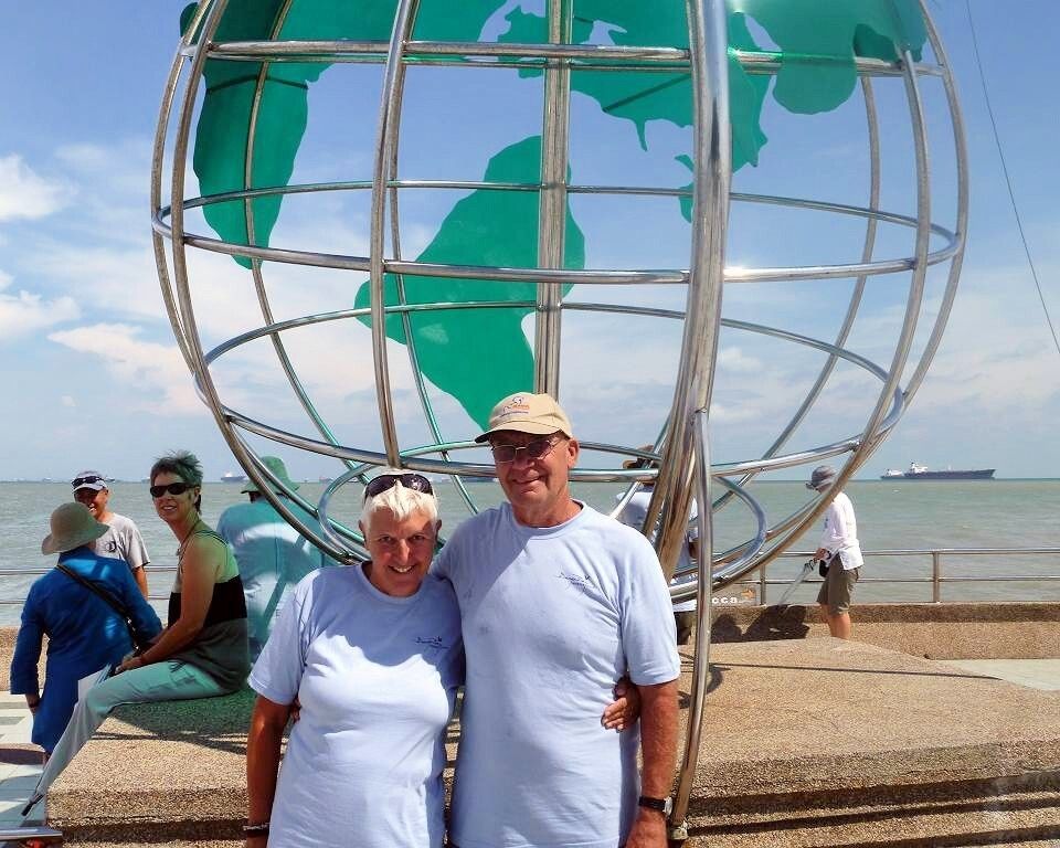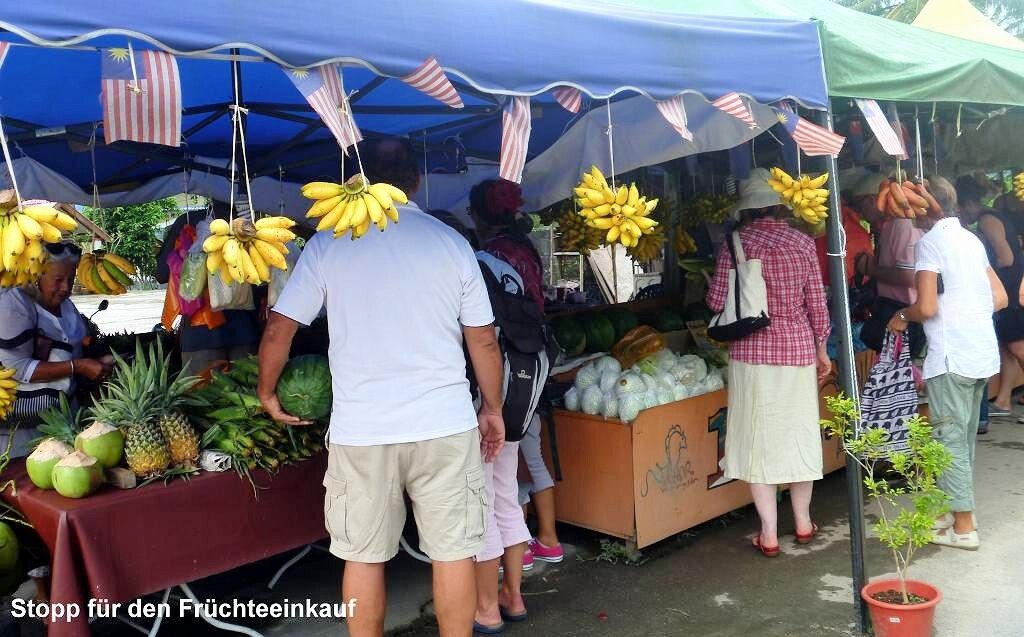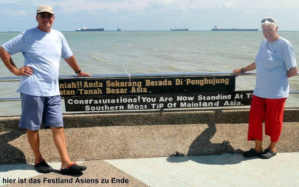 In einem schönen Restaurant, wo wir mit Trommeln empfangen werden, gibt es um 13h schon wieder zu Essen. Mmm..., sehr viele gute Sachen. Um 14h fahren wir los in den „Tanjung Piai“, in den Nationalpark, an der „Malakka Strasse“ wo es 25 verschiedene Sorten Mangroven gibt. Die Malayen haben nach dem Tsunami 2002 gemerkt, dass man die Mangroven schützen muss und setzen seitdem mit Studenten neue. Wir laufen ein Stück durch den Park, hören und sehen dabei die Langschwanz Makaken lauthals streiten und einander auf die Bäume jagen. Am südlichsten Punkt des asiatischen Festlandes machen wir das obligate Foto und kehren zu den Bussen zurück. Hier sind wir ca. 100 km von der Stadt Johor Bahru entfernt. Es regnet. Unterwegs haben wir die Gelegenheit frische Ananas und Bananen zu kaufen. Auf der Rückfahrt machen wir noch in einem Outletshop halt, wo es Klamotten, Schuhe, Parfüms von 80 Marken günstig zu kaufen gibt. Der Guide bewilligt uns eine ½ Stunde. Die meisten nutzen diese Zeit um einen Kaffee zu trinken. Nach der ½ Stunde sitzen wir alle im eisgekühlten Bus und warten auf 3 Franzosen, die noch fehlen. Endlich kommen sie gemütlich an, nach dem stolzen Kauf einer pinkfarbenen Jeans (für eine Frau in meinem Alter). Ihr Mann meint cool, er habe verstanden, wir hätten eine ganze Stunde Zeit! Die anderen beiden Busse sind schon längst weg. Um 18h45 sind wir endlich, total durchgefroren, zurück in unserer Marina. Es regnet immer noch.