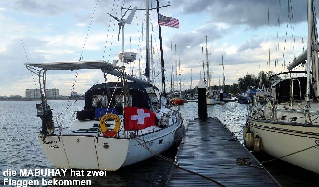 Nach dem Mittagessen braut sich eine gewaltige schwarze Wand zusammen und kurz darauf regnet es. Um 14h30 müssen wir beim Marinabüro sein, um zum Einklarierungsamt zu fahren. Es darf nur eine Person pro Boot mitfahren. Also bleibt Paul zurück, weil er kein Englisch spricht. Aber er hätte genau so gut gehen können. Im Einklarierungsamt (Zollfreie Zone) müssen wir einfach unserem Fahrer alle Pässe abgeben und sonst gar nichts. Wir warten etwa 1½ Stunden und ich hole inzwischen Malayische Ringgits an der Geldmaschine. Unterdessen schüttet es wieder mal aus allen Rohren! Um 17h sind wir zurück in der Marina, die Personen und Schiffe sind jetzt einklariert. Nun dürfen wir 90 Tage hier in Malaysia bleiben.