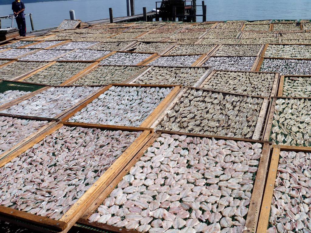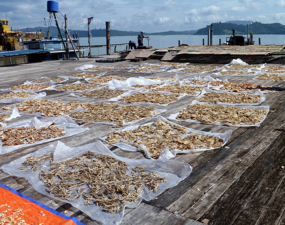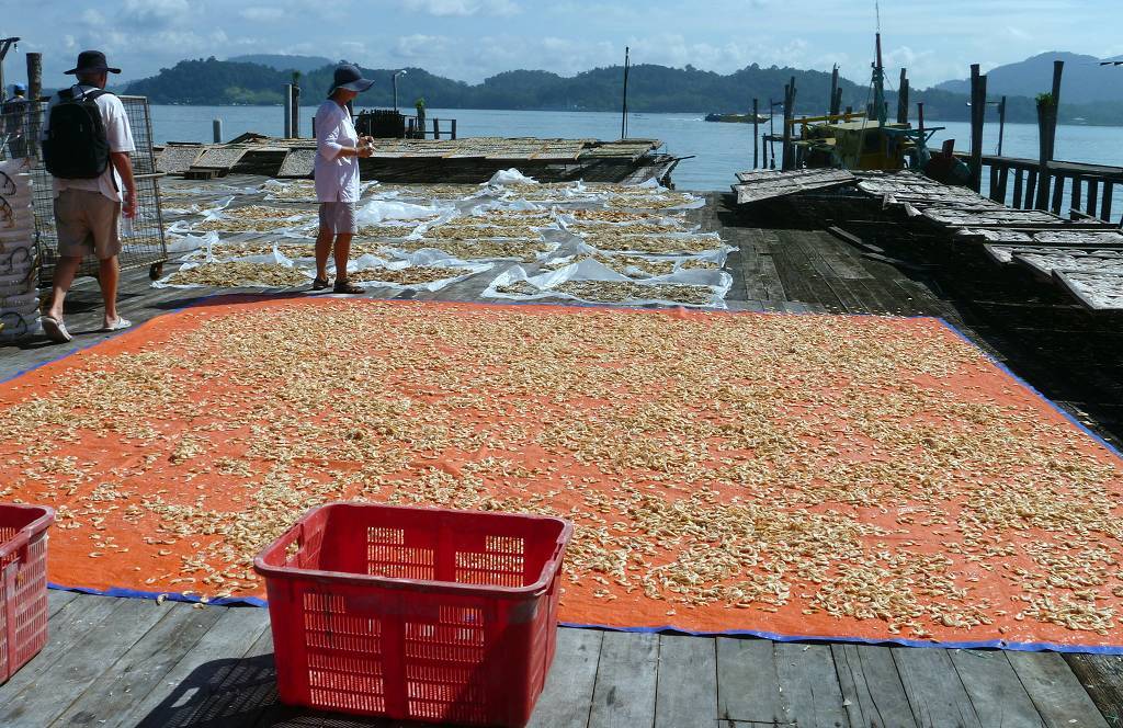 In Pangkor City werden wir auf 5 pinkige Taxis verteilt und dann geht es an die Südspitze der Insel. Hier befindet sich ein Fort, das die Holländer 1621 erbaut haben, es ist nicht besonders spektakulär. Weiter geht die Fahrt zu einem sehr schönen chinesischen Tempel. Hier hat es in einem Teich drei gewaltig grosse Fische, jeder bestimmt 2 m lang. Jetzt besuchen wir einen Fischverarbeitungs-betrieb. Das heisst, zuerst bringt man uns in den Laden, wo fleissig gekauft wird. Hier in Pangkor soll es scheinbar die besten Anchovis (winzige Fischlein) geben. Die werden mit Haut und Haaren vertilgt. Anschliessend sehen wir wie die Fische bearbeitet und getrocknet werden. Das ist ganz schön beeindruckend. Die nächste Station ist eine Werft, wo neue Holzschiffe für Fischer hergestellt werden. Das Holz dafür stammt meist aus Indonesien und Burma. So ein fertiges Schiff kostet um die 500'000 SFr. und ist nach 6 Monaten abbezahlt. Das Schiff hat eine Lebensdauer von 20 Jahren. Nun müssen wir uns nochmals einen chinesischen Tempel anschauen, aber der ist überhaupt nicht schön! Mittagessen gibt es in einem chinesischen Lokal für die Einheimischen. Und es ist wieder supergut. Eine Platte Reis wird in die Mitte des Tisches gestellt und dann folgen eine Platte nach der anderen mit vielen Köstlichkeiten; Fisch, Huhn, Beef, Weichschalenkrebse (noch nie gehört, aber er schmeckt nicht schlecht), Tintenfisch (Gummiringli), Shrimpssalat, gemischtes Gemüse. Der Marinamanager James Koo bezahlt alles, sogar unsere Getränke. Mit der 14h30 Fähre geht es zurück zur Marina.