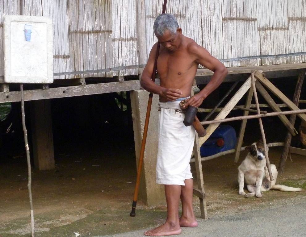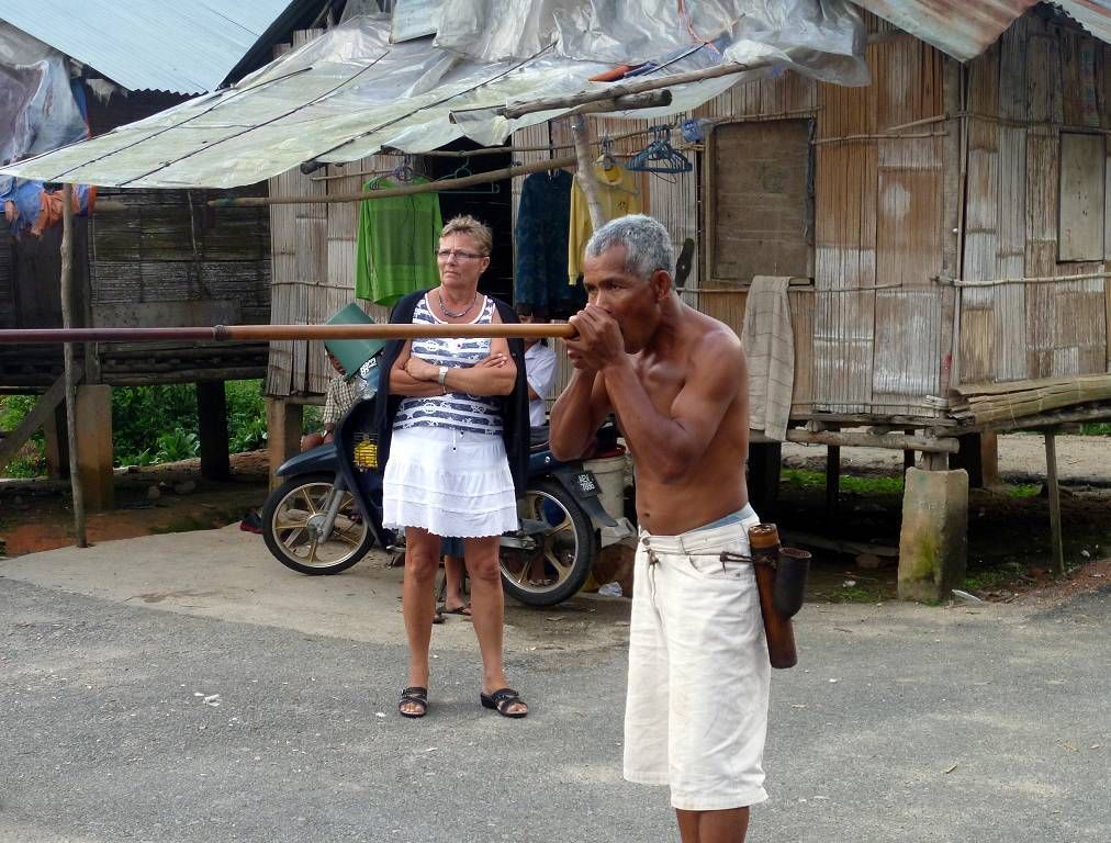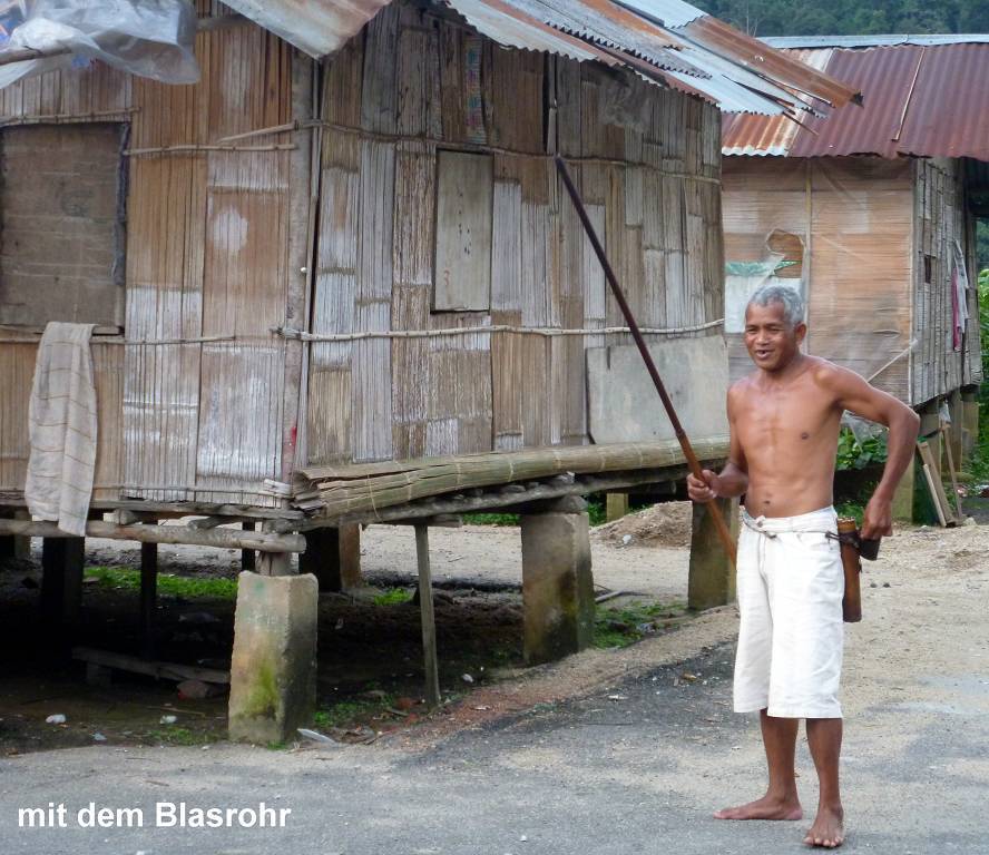Ein Mann führt uns vor, wie die Orang Asli (Orang =Mensch, Asli= Natur, Original), mit dem Blasrohr (giftige) Pfeile abschiessen. Es gibt Stämme die leben im dichtesten Dschungel und kommen nie heraus.