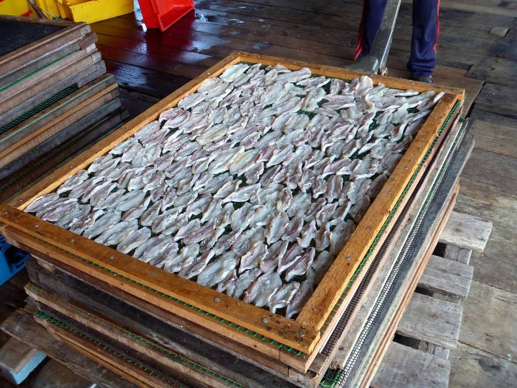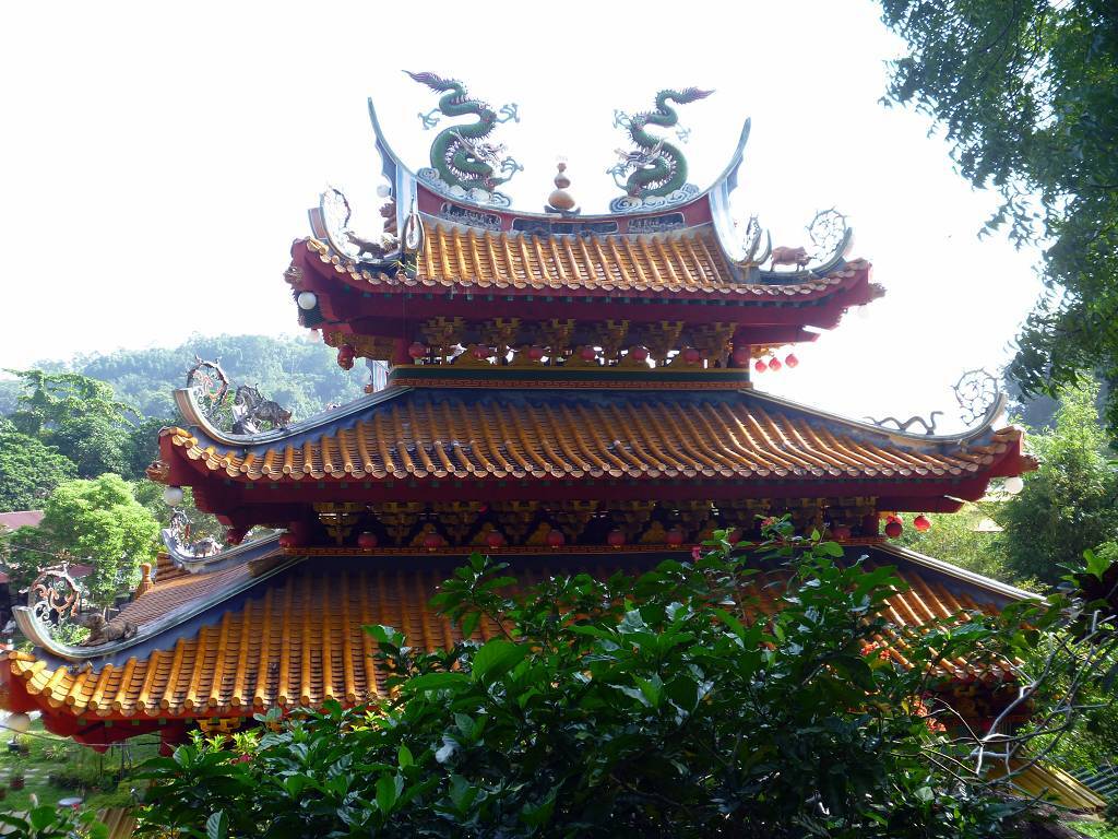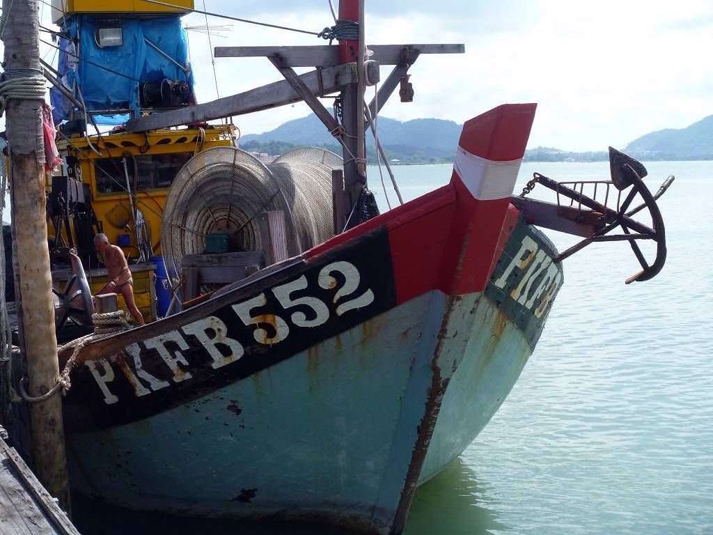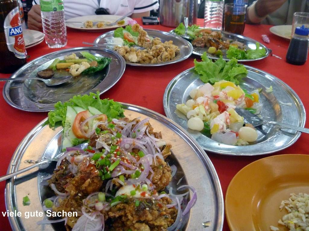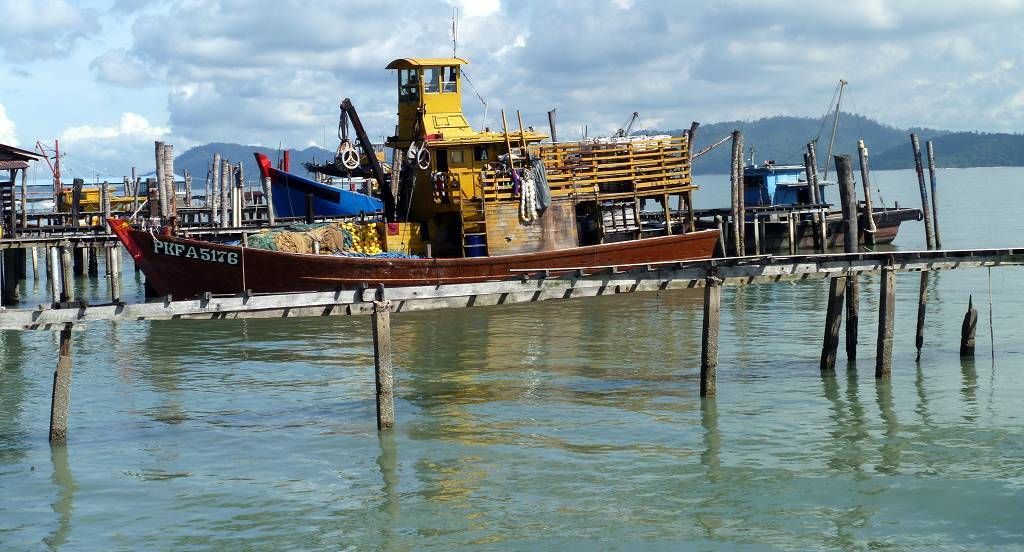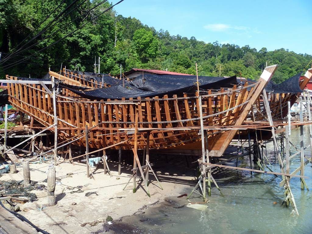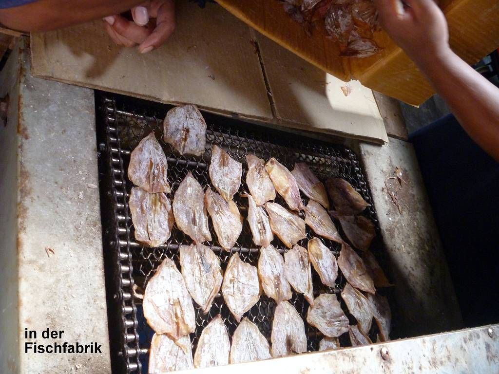 In Pangkor City werden wir auf 5 pinkige Taxis verteilt und dann geht es an die Südspitze der Insel. Hier befindet sich ein Fort, das die Holländer 1621 erbaut haben, es ist nicht besonders spektakulär. Weiter geht die Fahrt zu einem sehr schönen chinesischen Tempel. Hier hat es in einem Teich drei gewaltig grosse Fische, jeder bestimmt 2 m lang. Jetzt besuchen wir einen Fischverarbeitungs-betrieb. Das heisst, zuerst bringt man uns in den Laden, wo fleissig gekauft wird. Hier in Pangkor soll es scheinbar die besten Anchovis (winzige Fischlein) geben. Die werden mit Haut und Haaren vertilgt. Anschliessend sehen wir wie die Fische bearbeitet und getrocknet werden. Das ist ganz schön beeindruckend. Die nächste Station ist eine Werft, wo neue Holzschiffe für Fischer hergestellt werden. Das Holz dafür stammt meist aus Indonesien und Burma. So ein fertiges Schiff kostet um die 500'000 SFr. und ist nach 6 Monaten abbezahlt. Das Schiff hat eine Lebensdauer von 20 Jahren. Nun müssen wir uns nochmals einen chinesischen Tempel anschauen, aber der ist überhaupt nicht schön! Mittagessen gibt es in einem chinesischen Lokal für die Einheimischen. Und es ist wieder supergut. Eine Platte Reis wird in die Mitte des Tisches gestellt und dann folgen eine Platte nach der anderen mit vielen Köstlichkeiten; Fisch, Huhn, Beef, Weichschalenkrebse (noch nie gehört, aber er schmeckt nicht schlecht), Tintenfisch (Gummiringli), Shrimpssalat, gemischtes Gemüse. Der Marinamanager James Koo bezahlt alles, sogar unsere Getränke. Mit der 14h30 Fähre geht es zurück zur Marina.