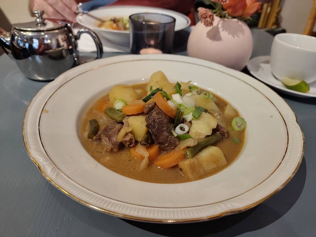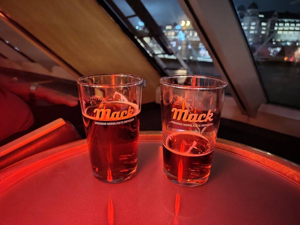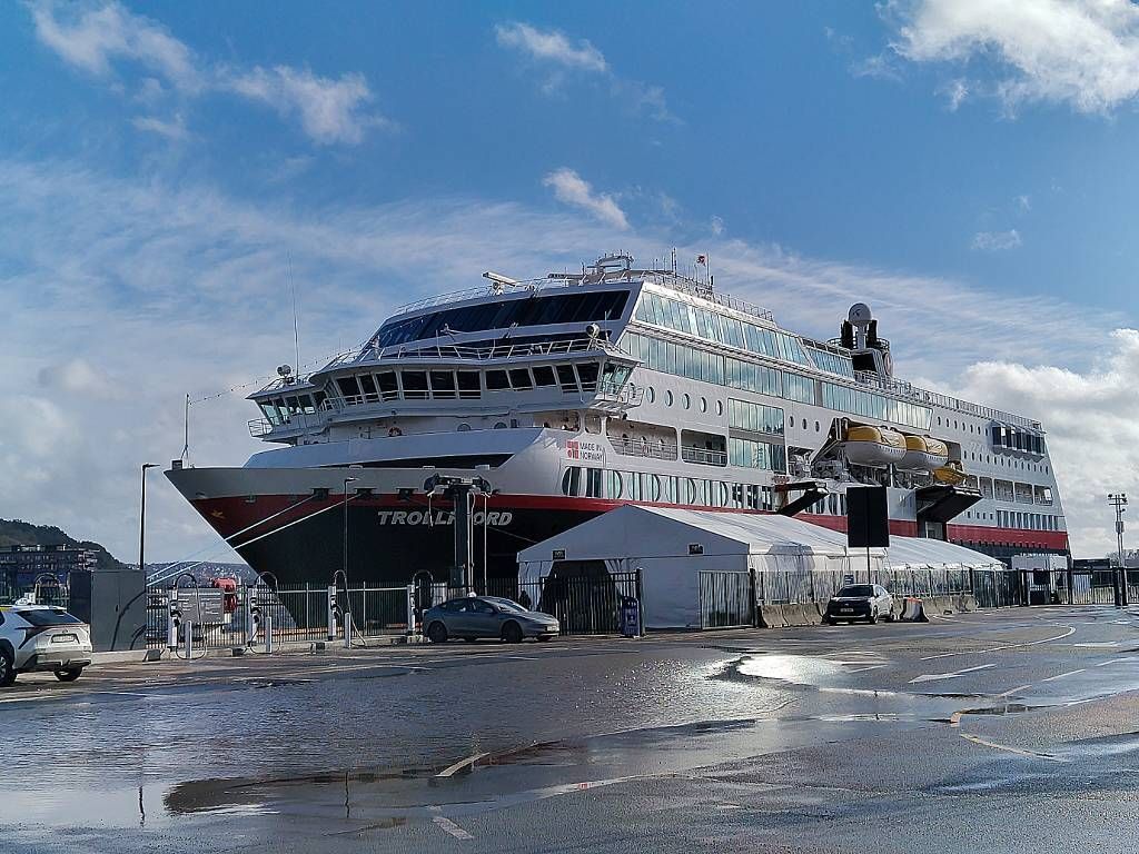 Gegen Mittag rufen wir ein Taxi und werden zur Anlegestelle des Hurtigrutenschiffs gebracht. Ab 12h darf man hier das Gepäck deponieren. Das machen wir und laufen dann bis zum Restaurant «SPOR av NORD». Hier bestellen wir ein Rentiercurry, ohne zu wissen, was wir bekommen werden. Das Curry ist wunderbar und gut, aber leider fast total kalt. Schade! Trotzdem sitzen wir hier und essen und trinken so lange, bis wir um 15h endlich bei unserem Kreuzfahrten Schiff «MS Trollfijord» einchecken dürfen. Jetzt scheint die Sonne, aber der eisige Wind bleibt uns treu.