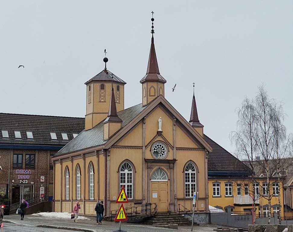 Die Eismeerkathedrale, offiziell Tromsdalen Kirke, wurde 1965 nach Plänen des Architekten Jan Inge Hovig erbaut und liegt auf einem kleinen Hügel im Tromsdalen-Tal, gut sichtbar von der Tromsø-Brücke und vom Fjord aus.
