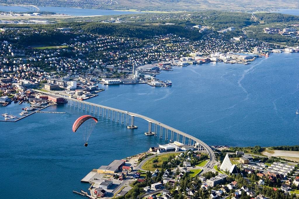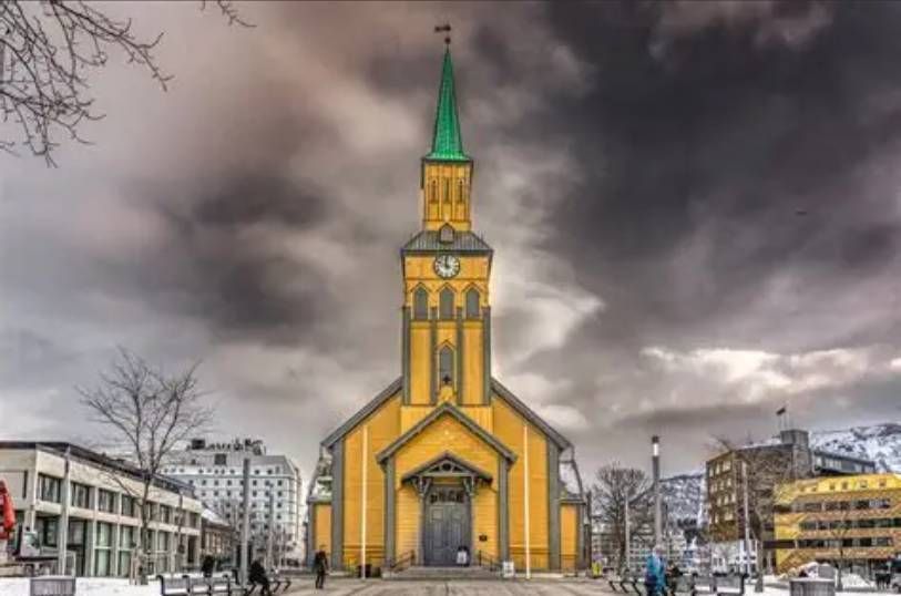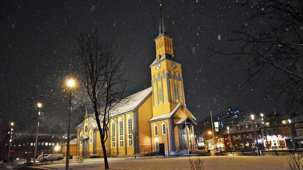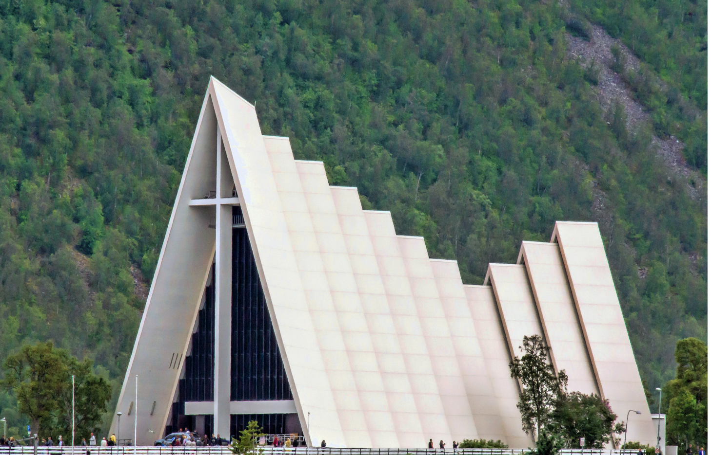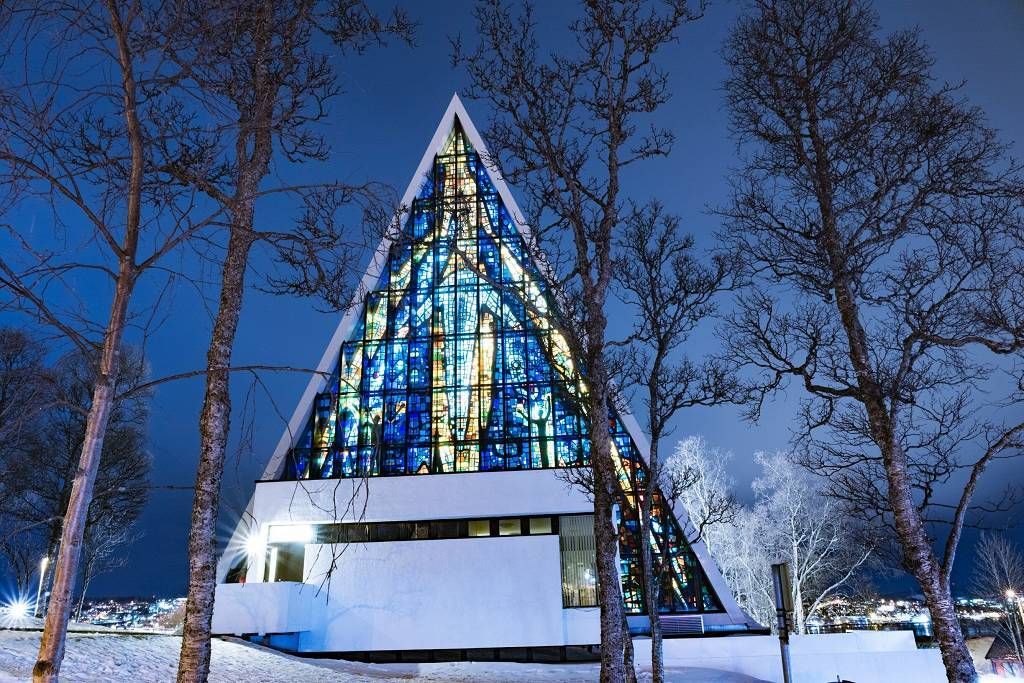Die Eismeerkathedrale, offiziell Tromsdalen Kirke, wurde 1965 nach Plänen des Architekten Jan Inge Hovig erbaut und liegt auf einem kleinen Hügel im Tromsdalen-Tal, gut sichtbar von der Tromsø-Brücke und vom Fjord aus.