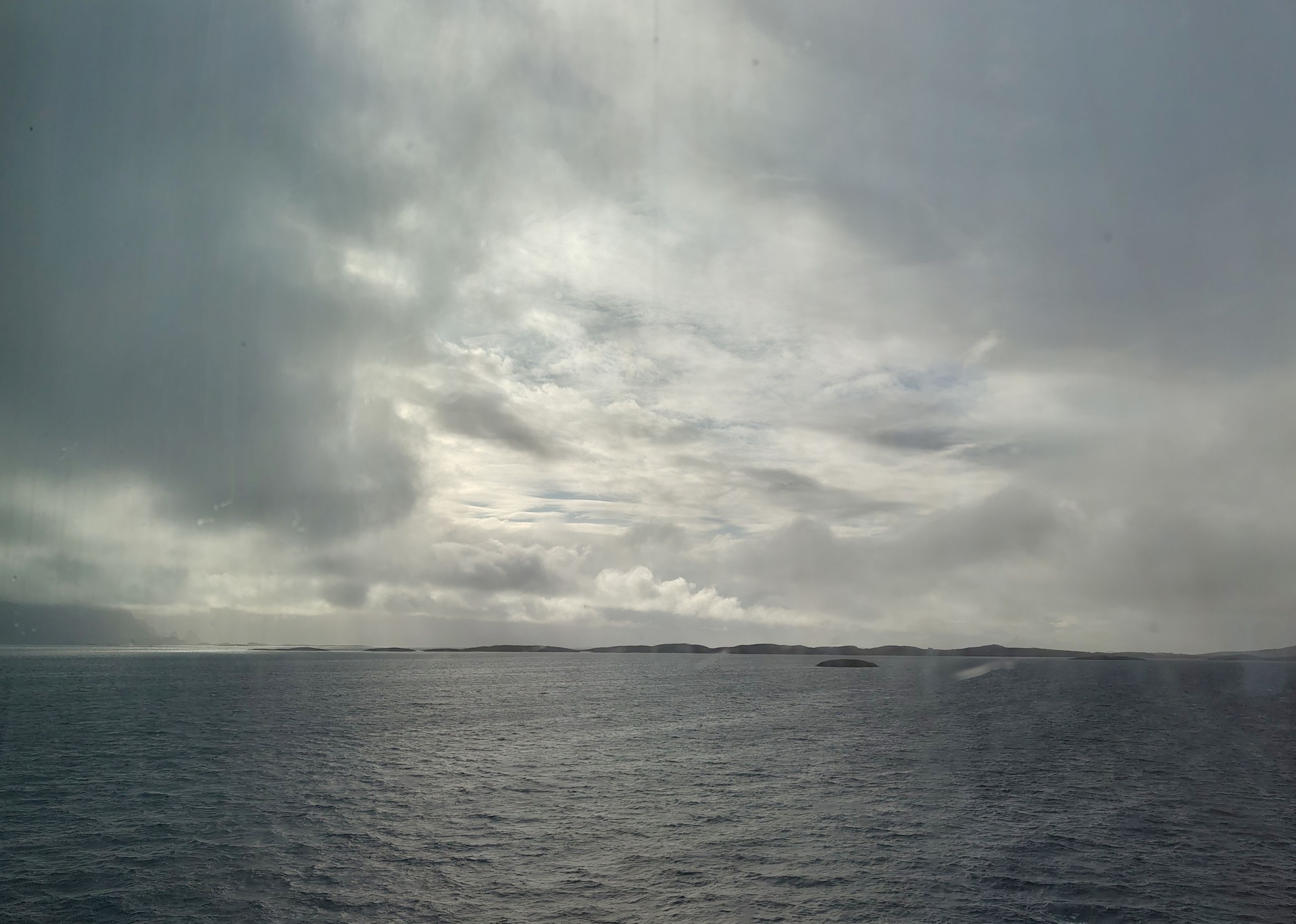 Um 10h15 legen wir ab, wir müssen den Kai verlassen, weil das «Havila» Schiff kommt und dort anlegen muss. Wir «dümpeln» ganz langsam zwischen den vielen Inseln herum. Plötzlich machen wir eine Wende und fahren wieder zurück Richtung Ørnes. Und irgendwann wird wieder gewendet und es geht endlich In die richtige Richtung, nämlich nach Süden. Und es gibt keinerlei Informationen, was Paul und ich nicht rrichtig finden.