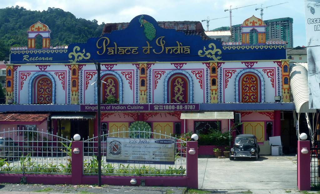 Das Abendessen gibt es in einem riesigen vollbesetzten Lokal. Das Essen ist indisch und wird uns auf Bananenblättern serviert. Jeder bekommt einen Berg gelben, langen Reis auf sein Bananenblatt geklatscht, dazu Gemüse und Joghurtsauce. Dann nimmt man aus den kleinen Platten Hühner- oder Lammcurry dazu und sollte jetzt eigentlich mit den Fingern essen. Aber man hat Erbarmen mit uns und gibt uns Gabeln und Löffel. Alles ist sehr gut, aber ziemlich „spicy“ (scharf).