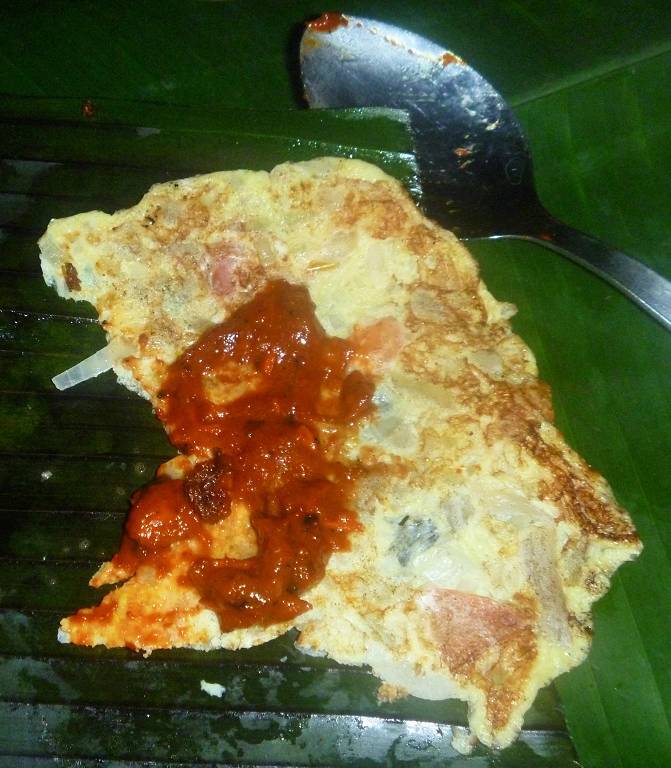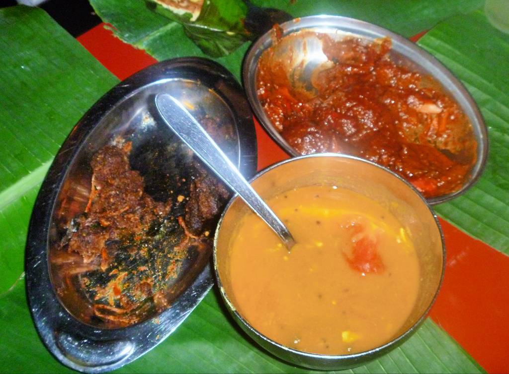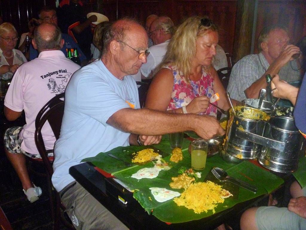 Das Abendessen gibt es in einem riesigen vollbesetzten Lokal. Das Essen ist indisch und wird uns auf Bananenblättern serviert. Jeder bekommt einen Berg gelben, langen Reis auf sein Bananenblatt geklatscht, dazu Gemüse und Joghurtsauce. Dann nimmt man aus den kleinen Platten Hühner- oder Lammcurry dazu und sollte jetzt eigentlich mit den Fingern essen. Aber man hat Erbarmen mit uns und gibt uns Gabeln und Löffel. Alles ist sehr gut, aber ziemlich „spicy“ (scharf).