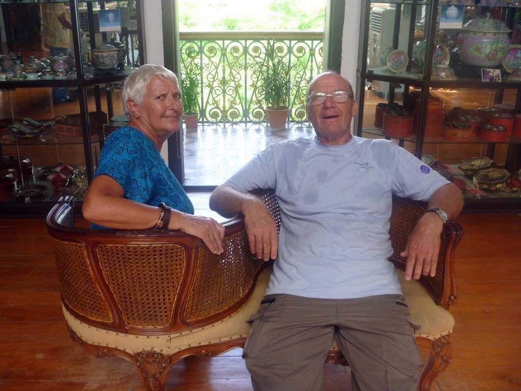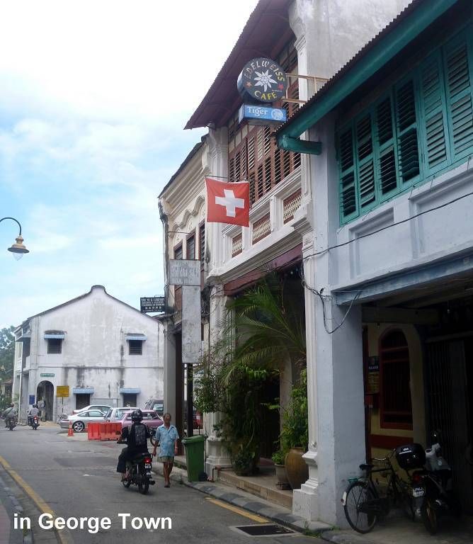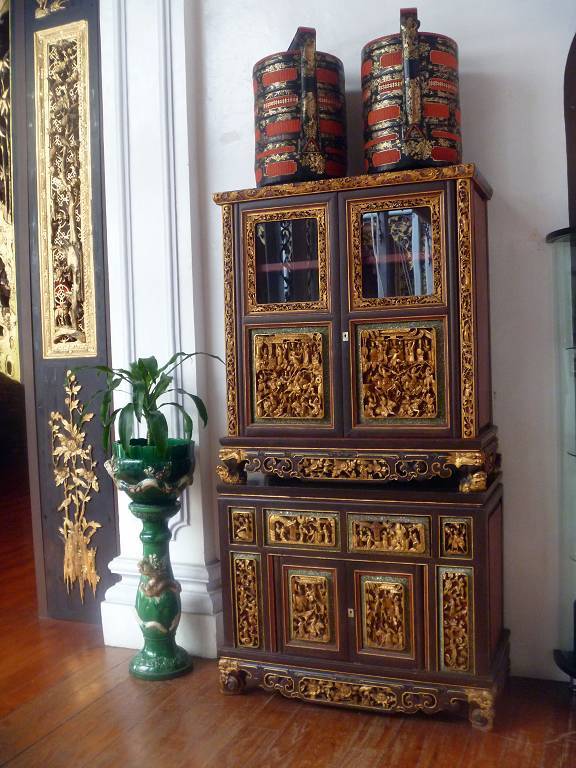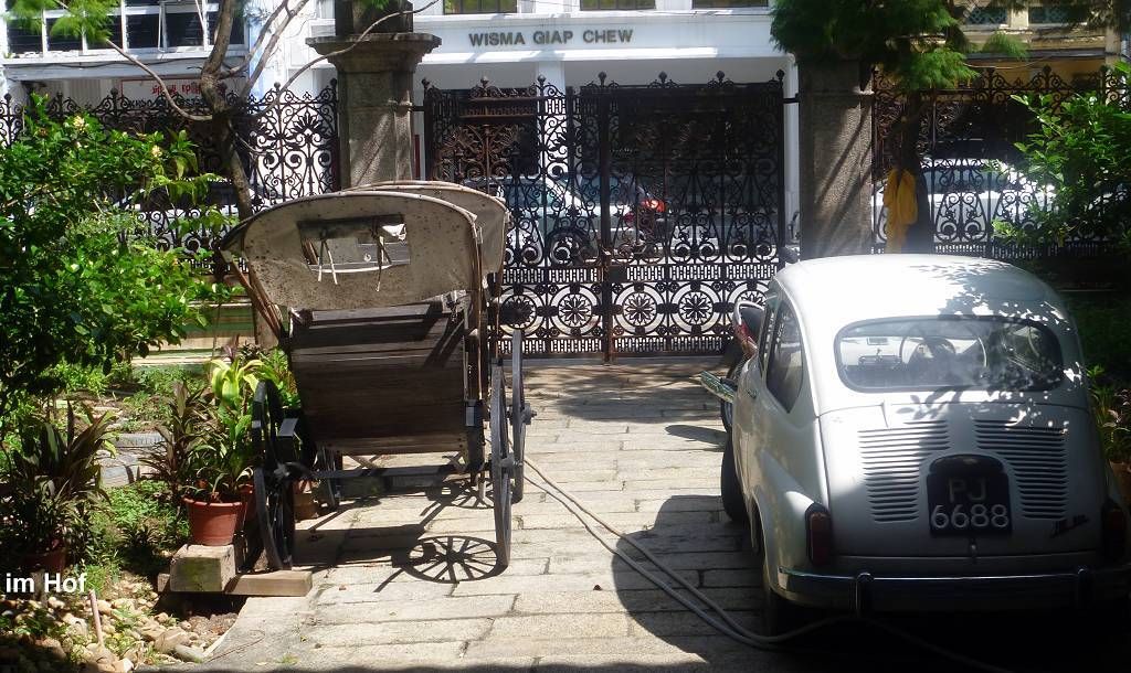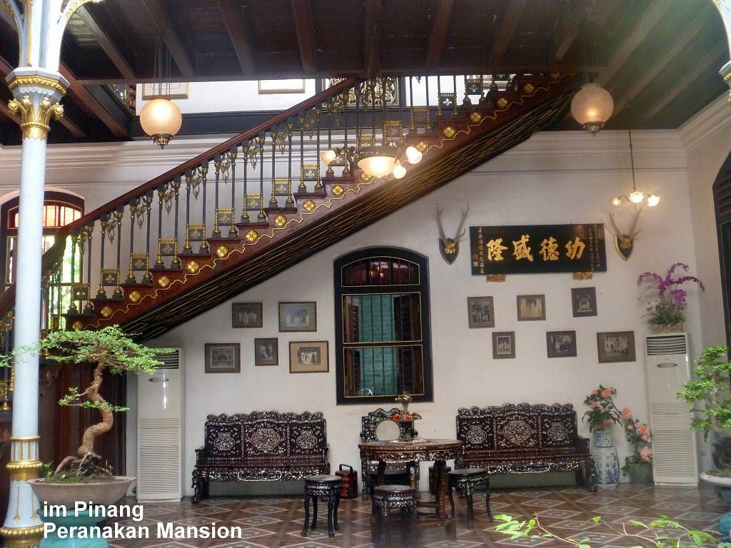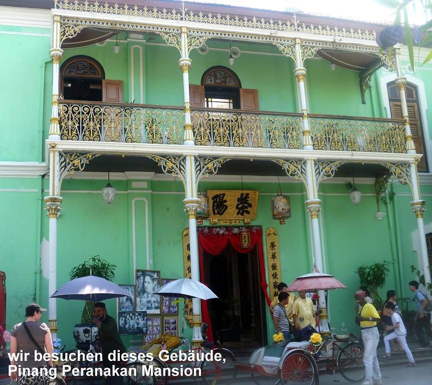 Mit einem Taxi fahren wir jetzt ins Zentrum der Stadt. Wir wollen uns die „blue mansion“ das blaue Haus ansehen. Ein herrschaftliches Haus eines Chinesen aus dem 19. Jahrhundert. Der Chinese kam mit seinen letzten paar Rappen aus China hier an und hat es zu grossem Reichtum gebracht. Er bekam sogar den Namen “Rockefeller Asiens“. Zufällig treffen wir auf Steven von der „Liberté“. Er sagt uns, das „Pinang Peranakan Mansion“ solle noch schöner sein. Also laufen wir quer durch die Altstadt zu diesem Mansion. Zusammen mit Liz und Steven haben wir eine Führung durch das Gebäude. Auch dieses Haus gehörte einem Chinesen, einem Opiumbaron, und ist ein prachtvoller Bau mit vielen wunderschönen Möbeln und Gegenständen. Das Haus hat sogar einen chinesischen Tempel, wo an der Decke viele Fledermäuse hängen. Die bringen Glück, sagt unser Führer.
