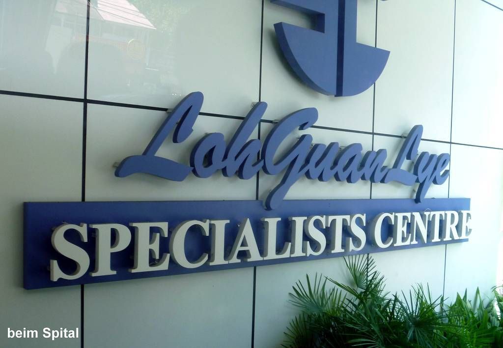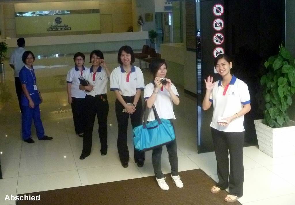 Es ist schon nach 14h, wir haben alle Durst und Hunger, als wir endlich unser Ziel, das Loh Guan Lye Spital www.lohguanlye.com erreichen. Wir werden sehr freundlich empfangen und sofort ins Auditorium im 10.Stock geführt, wo wir uns gierig auf die Nudeln mit Huhn, Dessert und Tee stürzen. Während wir essen wird uns ein kleiner Film über das Privatspital gezeigt. Danach werden wir herumgeführt und bestaunen die unglaubliche Aussicht von hier oben. Besonders von der „Präsidentensuite“ (auch im 10.Stock) ist sie gewaltig! Man zeigt uns in verschiedenen Stockwerken Interessantes, unter anderem auch in der Onkologie den Bestrahlungsapparat. Alles superschön und modern. Ich hatte immer geglaubt, wir hätten in der Schweiz ganz tolle Spitäler, aber jetzt....???