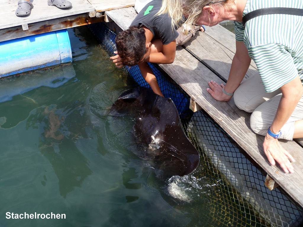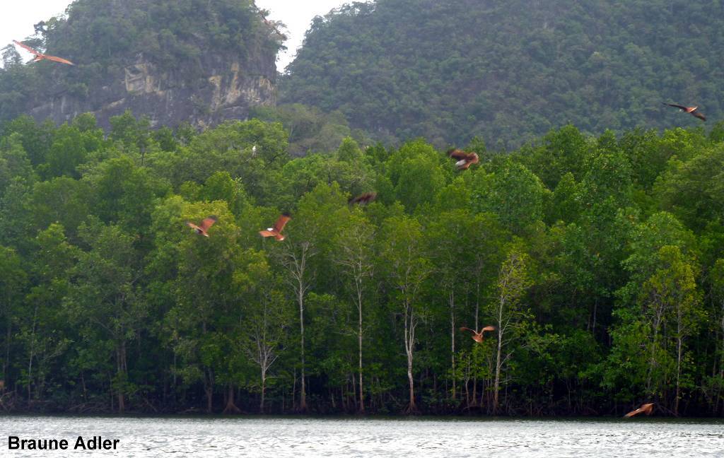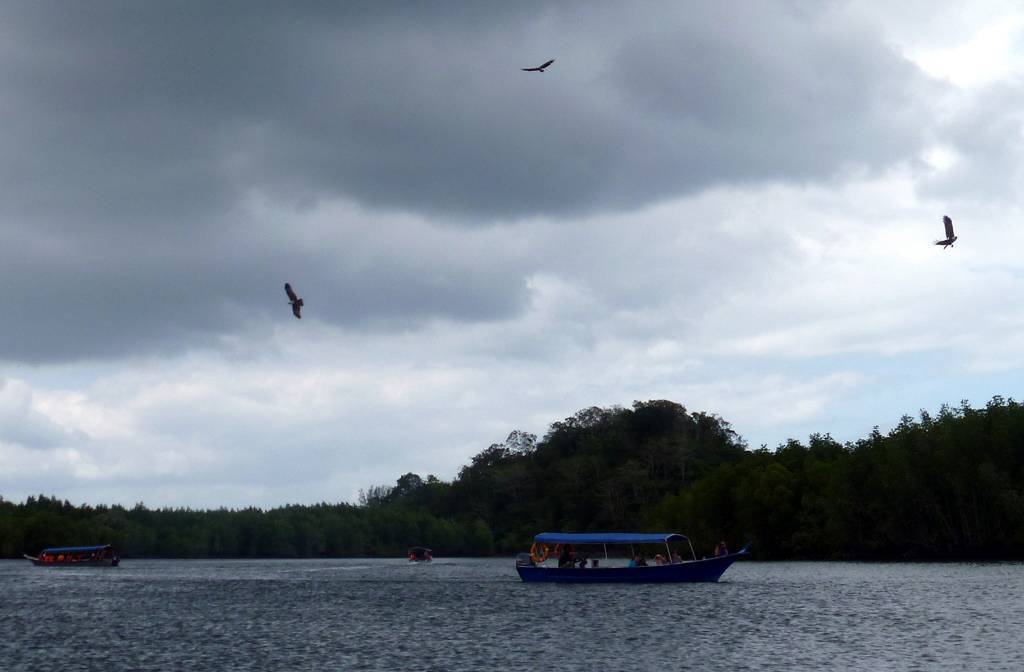 Also fahren wir wieder hinunter und fahren nach Tanjung Rhu, an der Nordküste der Insel. Hier werden wir überedet, eine 2-stündige Bootstour zu machen. Und weil wir ja so lange nicht mehr Boot gefahren sind, machen wir das. Mit einem Boot mit 85 PS Aussenborder brettern wir wie die Touris durch die Lagune. Das ist richtig toll. Wir sehen einen Seeotter, einen grossen Leguan, der sich auf einem Felsen sonnt, ganz viele Seeadler und Braune Adler, sowie jede Menge Affen. Wir fahren mit dem Boot durch eine schöne Höhle mit Stalagtiten und später laufen wir durch die Bat Cave, eine Höhle mit Fledermäusen. Die Höhle ist wunderschön aber Fledermäuse hat es nicht besonders viele. Auf der Fahrt durch diverse Canyons sehen wir wunderschöne Felsformationen und zum Schluss besichtigen wir eine Fischfarm, wo man uns verschiedene Fische zeigt, unter anderen auch 3 grosse Stachelrochen, die dem Guide aus der Hand fressen. Genau nach 2 Stunden, auf die Minute sind wir zurück am Ausgangspunkt. Inzwischen ist es 14h45, wir haben noch nicht zu Mittag gegessen und getrunken auch noch fast nichts. Es ist fast 15h45 als wir an einem Stand einen noch heissen, gezuckerten Teigring (wie ein Berliner, aber ohne Konfitüre) essen, ohne dazu etwas zu trinken. Den Rückweg fahren wir an der Ostküste entlang. In Kuah erledigen wir noch verschiedene Einkäufe. In einem chinesischen Grosshandelsladen kaufen wir 4 kg Erdbeer-Emmi-Yoghurt und 2,4 kg Emmi-Gruyère-Käse (den teilen wir aber mit der „FREYJA“) und sind um 17h zurück bei den Dinghys. Paul muss sofort den Käse degustieren und er ist wirklich prima, (1 Kilo 65 Ringgit = etwa 21 Sfr.). Ich habe heute einen Kalender für 2013 gekauft (10 Ringgit= 3 Sfr.).