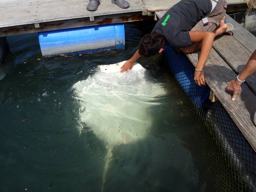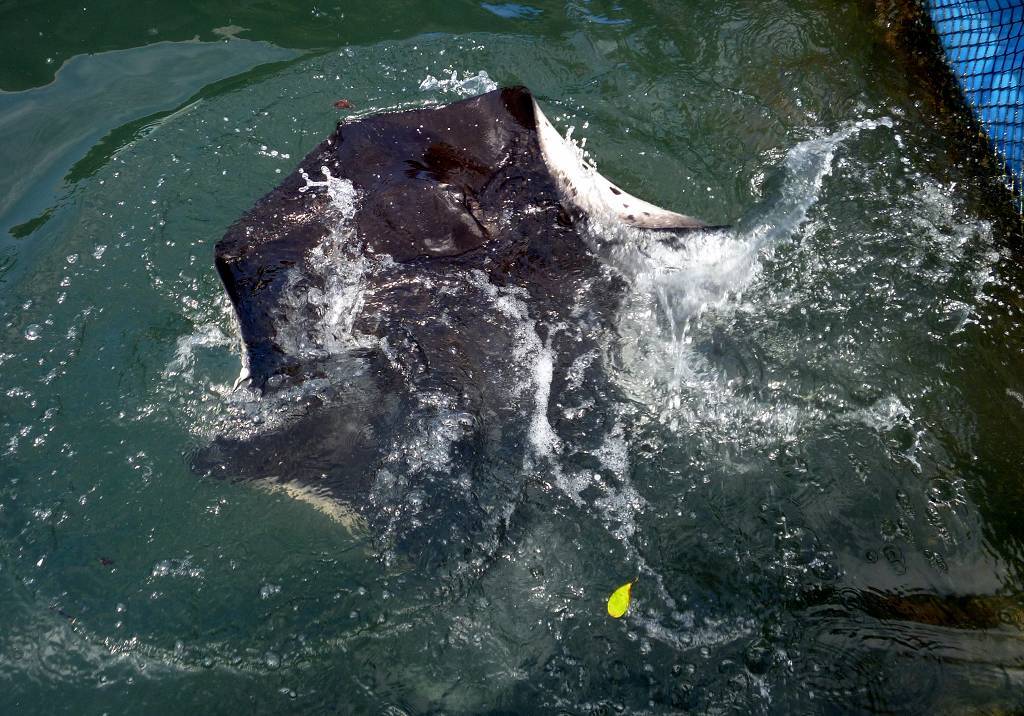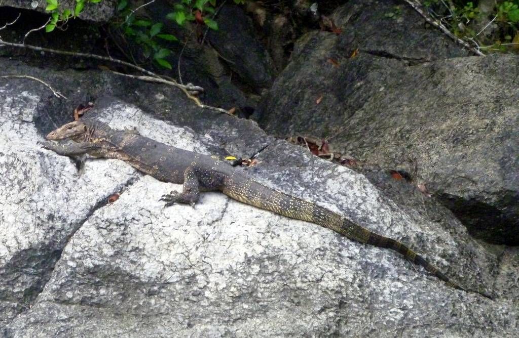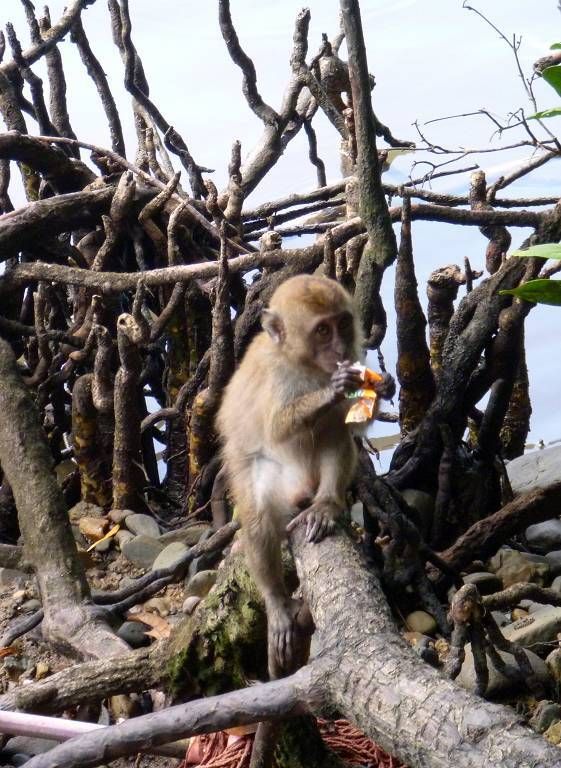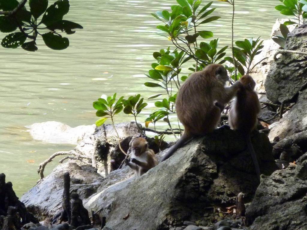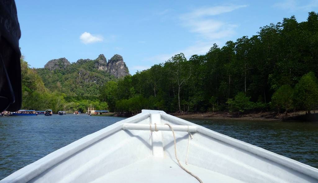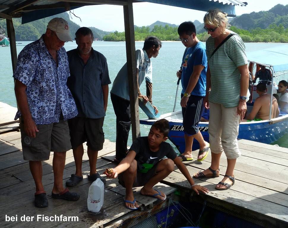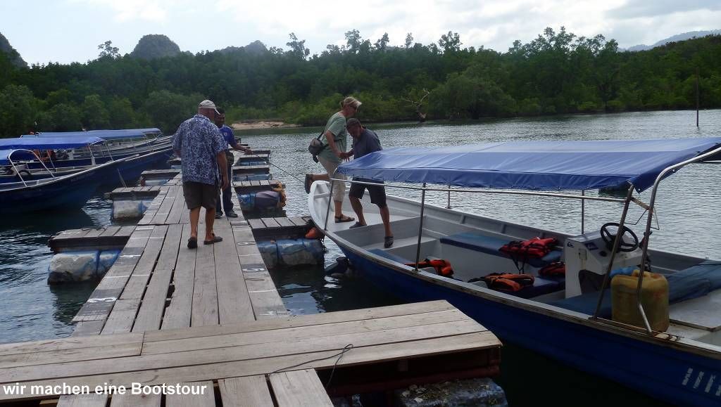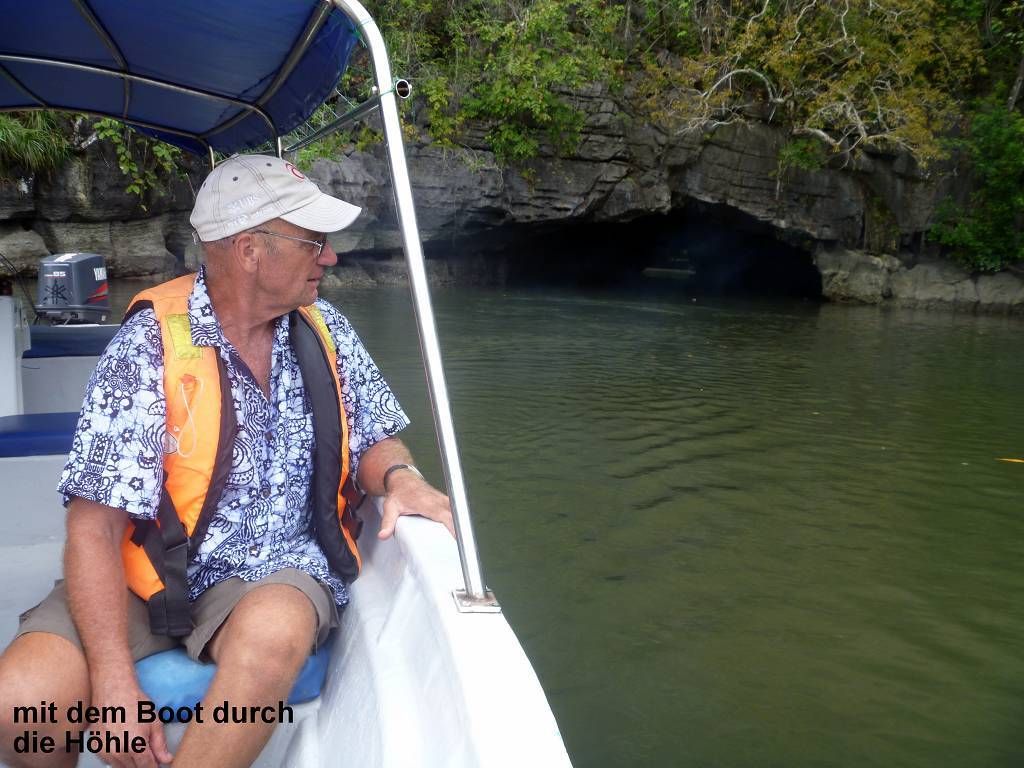 Also fahren wir wieder hinunter und fahren nach Tanjung Rhu, an der Nordküste der Insel. Hier werden wir überedet, eine 2-stündige Bootstour zu machen. Und weil wir ja so lange nicht mehr Boot gefahren sind, machen wir das. Mit einem Boot mit 85 PS Aussenborder brettern wir wie die Touris durch die Lagune. Das ist richtig toll. Wir sehen einen Seeotter, einen grossen Leguan, der sich auf einem Felsen sonnt, ganz viele Seeadler und Braune Adler, sowie jede Menge Affen. Wir fahren mit dem Boot durch eine schöne Höhle mit Stalagtiten und später laufen wir durch die Bat Cave, eine Höhle mit Fledermäusen. Die Höhle ist wunderschön aber Fledermäuse hat es nicht besonders viele. Auf der Fahrt durch diverse Canyons sehen wir wunderschöne Felsformationen und zum Schluss besichtigen wir eine Fischfarm, wo man uns verschiedene Fische zeigt, unter anderen auch 3 grosse Stachelrochen, die dem Guide aus der Hand fressen. Genau nach 2 Stunden, auf die Minute sind wir zurück am Ausgangspunkt. Inzwischen ist es 14h45, wir haben noch nicht zu Mittag gegessen und getrunken auch noch fast nichts. Es ist fast 15h45 als wir an einem Stand einen noch heissen, gezuckerten Teigring (wie ein Berliner, aber ohne Konfitüre) essen, ohne dazu etwas zu trinken. Den Rückweg fahren wir an der Ostküste entlang. In Kuah erledigen wir noch verschiedene Einkäufe. In einem chinesischen Grosshandelsladen kaufen wir 4 kg Erdbeer-Emmi-Yoghurt und 2,4 kg Emmi-Gruyère-Käse (den teilen wir aber mit der „FREYJA“) und sind um 17h zurück bei den Dinghys. Paul muss sofort den Käse degustieren und er ist wirklich prima, (1 Kilo 65 Ringgit = etwa 21 Sfr.). Ich habe heute einen Kalender für 2013 gekauft (10 Ringgit= 3 Sfr.).