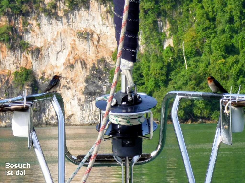 Um 16h gibt es zwei Gewitter und danach ist wieder schönster Sonnenschein. Zwei Schwälbchen sitzen fast zwei Stunden lang, ganz gemütlich auf unserem Bugkorb. Eines links und eines rechts.