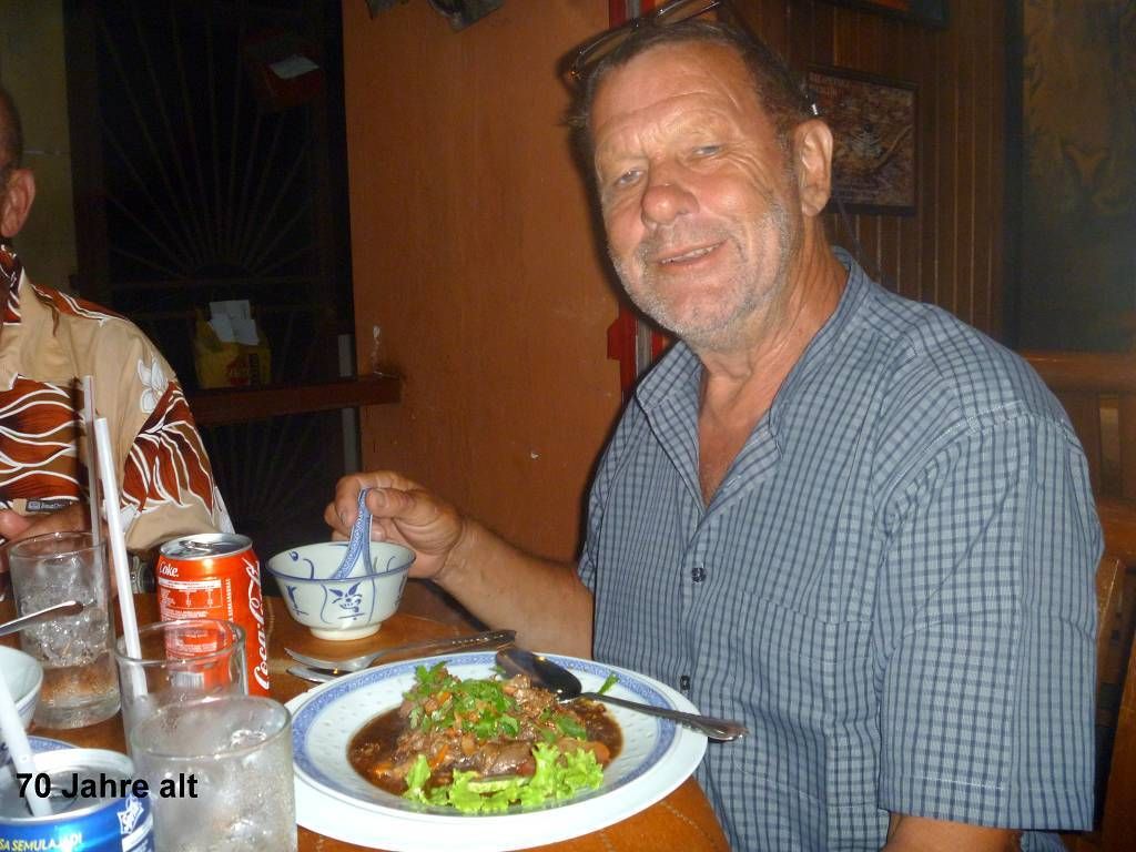 Abends essen wir zusammen an Land, im Café SOFEA. Holger und Paul schleppen unseren alten Aussenborder zum Müllcontainer. Als wir nach dem Essen zurückkommen, ist er schon weg. Das Essen ist sehr gut, 2 x Huhn mit Frühlingszwiebeln und sehr guter Sauce, 1 x Beef mit Frühlingszwiebeln und sehr guter Sauce, (je 22 Ringgit), dazu Reis (6 Ringgit) und wir bestellen eine grosse Portion Pommes Frites (12 Ringgit). Paul bekommt eine grosse Suppenschüssel voll Hühner/Gemüsesuppe (15 Ringgit).Als Getränke 2x Cola und 2x Sprite (zusammen 10 Ringgit). Als die Rechnung kommt, gibt es kurz leeres Schlucken. Alles zusammen kostet 140 Ringgit. Wir sind uns alle einig: das kann nicht stimmen! Wir reklamieren. Es wurden 2x Beef berechnet. Aber die Rechnung ist immer noch zu hoch. Wir reklamieren. Die dritte Rechnung stimmt auch wieder nicht. Jetzt zieht die Servierfrau den Chef zu Rate und wir bekommen eine neue Rechnung. Die ist zu niedrig 90.8o Ringgit. Dabei waren alles runde Zahlen, keine Kommastellen in der Speisekarte. Wir reklamieren. Die nächste Berechnung ergibt 90.60 Ringgit. Jetzt geben wir auf und mekern nicht mehr! Aber wir haben 18 Ringgit zu wenig bezahlt. Und weil das Essen so gut war, beschliessen wir einstimmig, am Weihnachtsabend wieder hier zu essen. Vielleicht können wir damit wieder gut machen, dass wir heute zu wenig bezahlt haben. Vielen Dank an Antje und Holger für das feine Geburtstags-Essen.!