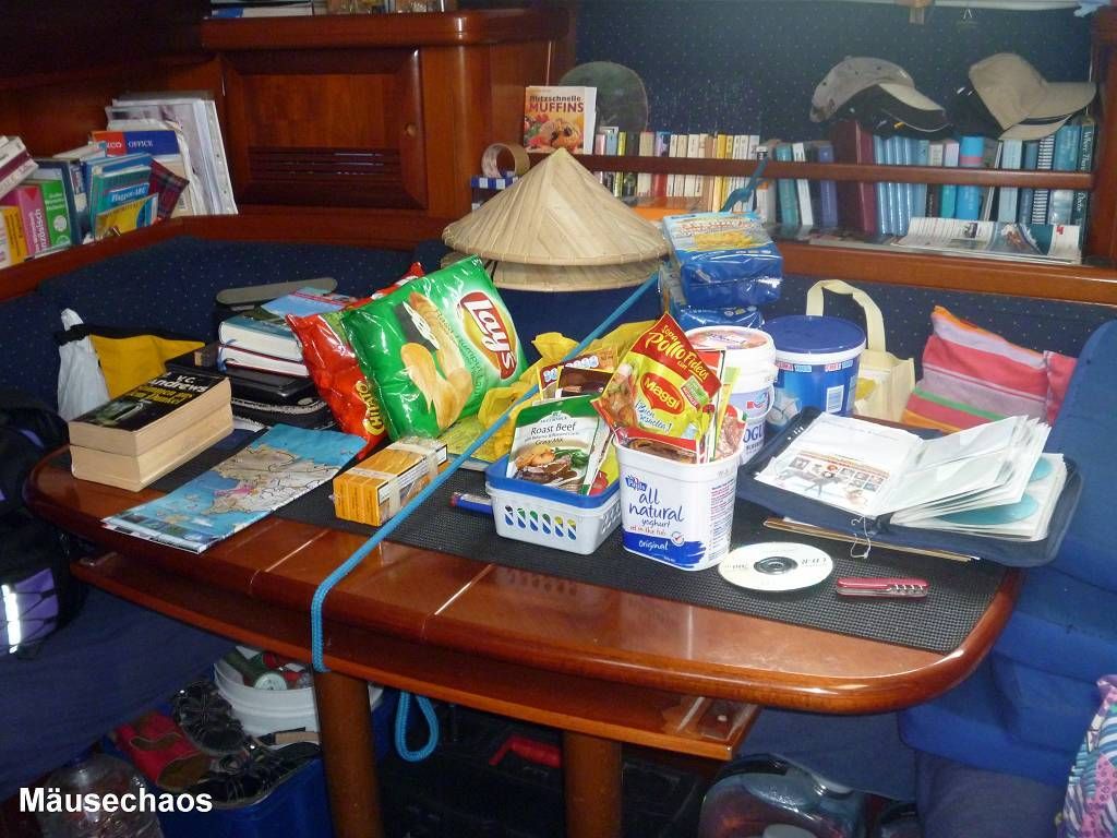 Also wieder zurück zum Supermarkt und jetzt wird ernsthaft eingekauft. Für den Rückweg nehmen wir uns ein Taxi und sind um 15h wieder bei den Dinghys. Kaum sind wir an Bord und haben alles verstaut, gibt es eine gewaltige Regenschütte. Und das höchste aller Gefühle, Paul tappt jetzt selber in die Leimfalle die er am Boden für unseren Gast, die Maus, ausgelegt hat. So eine Schweinerei und die ist nur noch mit „Bremsreiniger“ wieder wegzukriegen!